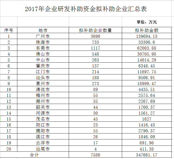 根据《关于激励企业研究开发财政补助试行(xíng)方案》(粤财工〔2015〕59号)、《广东省省级企业研究开发财政补助資(zī)金管理(lǐ)办法(试行(xíng))》(粤财工〔2015〕246号)和《广东省企业研究开发省级财政补助政策操作指引(试行(xíng))》(粤科(kē)政字〔2015〕164号)有关规定,现将2017年企业研究开发补助資(zī)金拟支持项目予以公示,公示期為(wèi)2017年12月7日- 12月13日,共7天。