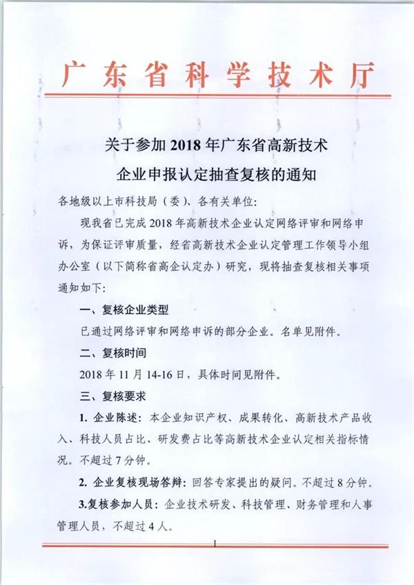 关于参加2018年广东省高(gāo)新(xīn)技术企业申報(bào)认定抽查复核的(de)通知