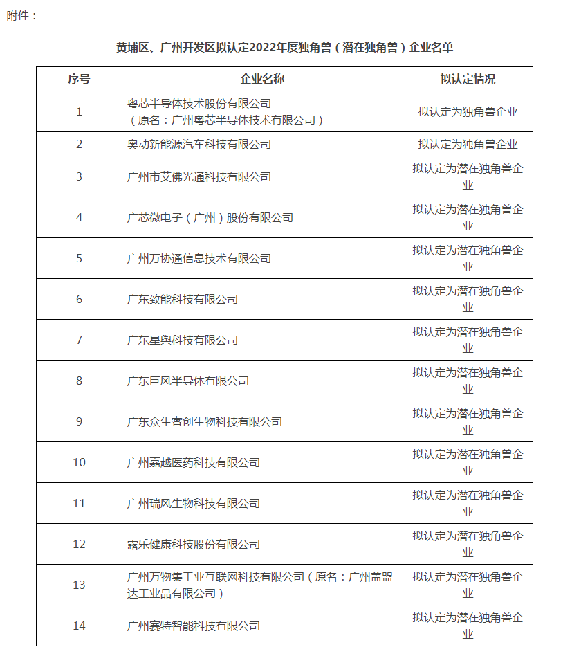 我(wǒ)局根据《广州市(shì)黄埔區(qū) 广州开发區(qū)促进高(gāo)成長(cháng)科(kē)技企业发展实施办法》(穗埔科(kē)规字〔2021〕5号)、《关于组织开展广州市(shì)黄埔區(qū) 广州开发區(qū)2022年独角兽(潜在(zài)独角兽)企业推荐申報(bào)工作的(de)通知》(穗埔科(kē)〔2022〕294号)等相关政策及规定,经公开征集、线上材料审核、紙(zhǐ)质材料复核、经营情况核实、现场检查核实、专家评审等环节,已完成黄埔區(qū)、广州开发區(qū)2022年度独角兽(潜在(zài)独角兽)企业申報(bào)认定审核工作,现对结果予以公示,名单详见附件(jiàn)。