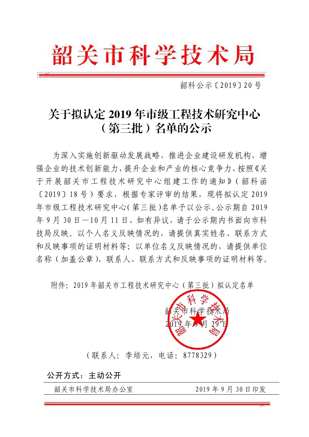 韶关市(shì)科(kē)學(xué)技术局关于拟认定2019年市(shì)级工程技术研究中心(第三批)名单的(de)公示