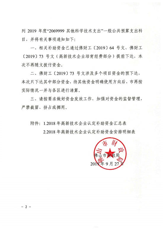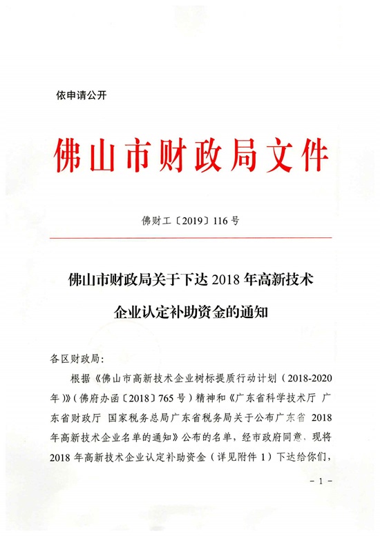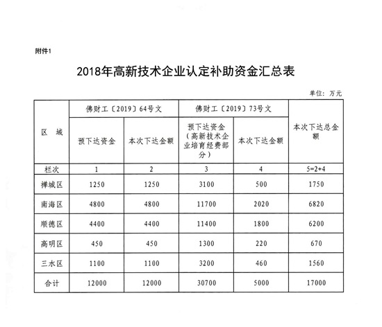 佛山市(shì)财政局关于下达2018年高(gāo)新(xīn)技术企业认定补助資(zī)金的(de)通知
