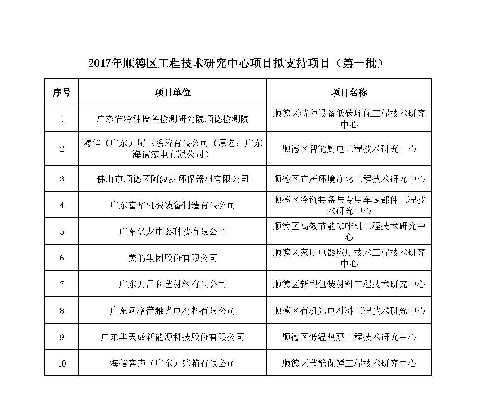 佛山市(shì)顺德區(qū)科(kē)學(xué)技术局关于2017年顺德區(qū)工程技术研究中心项目拟支持项目(第一批)