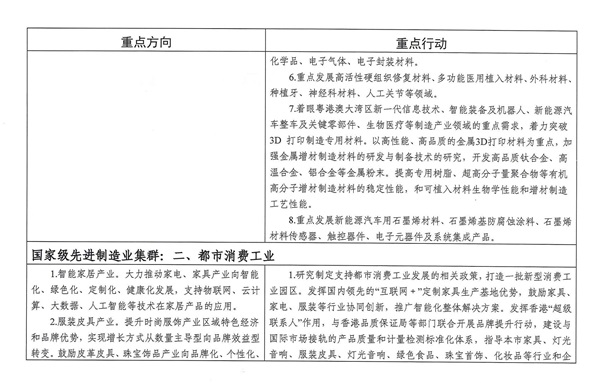 1.推动粤港澳大湾區(qū)先进制造业协同发展。以先进制造业集群為(wèi)重点,加强与大湾區(qū)城市(shì)产业合作,与深圳、东莞等市(shì)共建珠江东岸高(gāo)端电子(zi)信息制造产业带,与佛山、珠海、中山等市(shì)共建珠江西岸先进装备制造产业带。健全穗港、穗澳产业合作机制,争取更多先行(xíng)先试政策支持。落实广佛同城化(huà)(huà)战略合作框架协議(yì)深化(huà)(huà)版,共同打造汽车、新(xīn)一代信息技术、先进装备制造、生物(wù)醫(yī)药与健康四大万亿级产业集群。加强与深圳全方位相互支持和合作发展,强化(huà)(huà)与华為(wèi)、腾讯等龙头企业合作,共同探索“汽车+电子(zi)信息”、“检验检测+新(xīn)产品”、“5G+车联网”等方面深度合作,与深圳建设先行(xíng)示范區(qū)相互促进、相得益彰。(市(shì)工业和信息化(huà)(huà)局牵头;市(shì)发展改革委,各相关區(qū)政府配合)