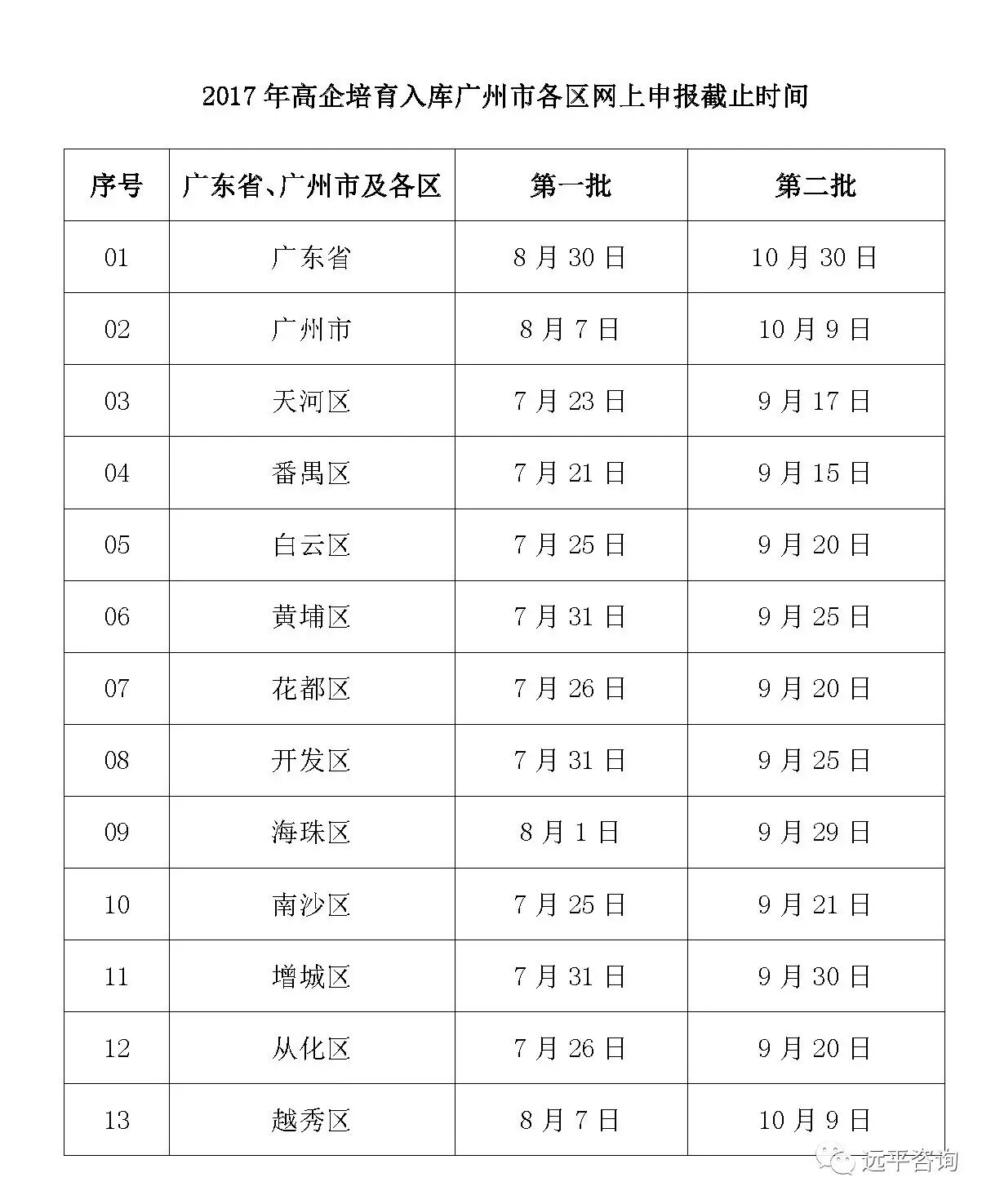 2017年广东省高(gāo)新(xīn)技术企业培育库入库项目已开始申報(bào)了,全省各地(dì)市(shì)培育机构根据辖區(qū)高(gāo)新(xīn)技术企业培育工作实际,自行(xíng)确定安排本辖區(qū)內(nèi)申報(bào)批次。其中广州市(shì)各區(qū)完成网上推荐及報(bào)送紙(zhǐ)质材料至市(shì)受理(lǐ)窗口的(de)截止时间分别為(wèi):8月7日前、10月9日前。企业向所在(zài)區(qū)科(kē)技管理(lǐ)部門(mén)提交申報(bào)材料的(de)截止时间以各區(qū)通知為(wèi)准。遠(yuǎn)平咨询為(wèi)您搜集整理(lǐ)好(hǎo)(hǎo)了广州市(shì)各區(qū)高(gāo)企培育入库网上申報(bào)截止时间,千万别错过了!